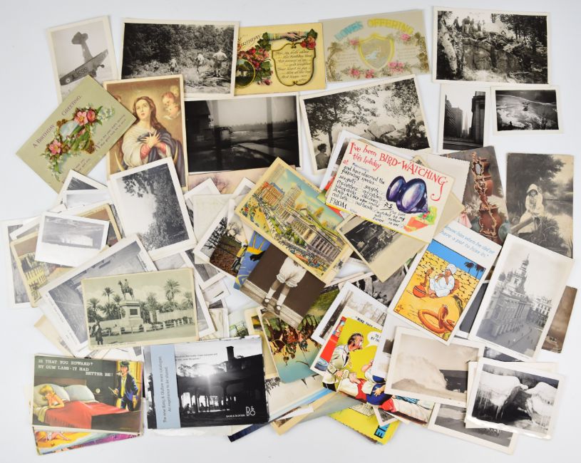 Collection of postcards, mostly topographical with many photographic images to include America and Canada (1900s) with parade of Blackfoot Indians, Iraq social history with barber, bake house and café, 1930s Austria, Mont Blanc, Athens, Luxembourg, Gibraltar, Switzerland, Istanbul, Australia, New Zealand with sheep droving and kookaburras, Cadiz Spain and Egypt etc with other humour and greeting cards together with 1950s photographs from Mombasa, Cape Town, Bombay, Canada and New York including aeroplanes and crash scenes (Handley Page, Douglas B18), snow ploughs, train