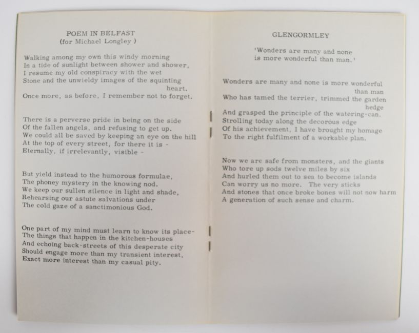 Eleven Poems by Seamus Heaney, published Festival Publications Queen’s University of Belfast (c.1965 possibly third issue), in publisher's green card covers. Ten Poems by Michael Longley (c.1965) in publisher's green card covers. Twelve Poems by Derek Mahon (c.1965) in publisher's green card covers [All three pamphlets list the reprint editions at 3s. 0d. on rear cover, 5 original editions at 2s. 6d. and 6 titles in the 2nd series of poetry pamphlets – they also carry the misspelling of Seamus 'Dean'] nice well preserved copies