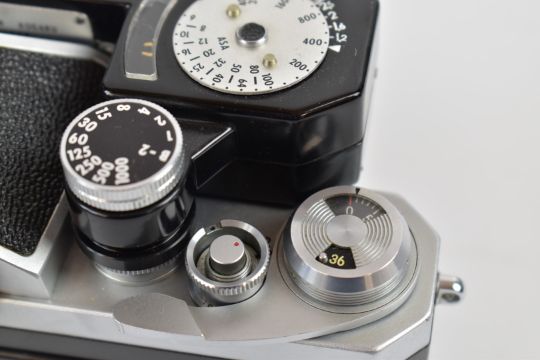 Nikon F 35mm SLR camera body, serial number 6801678, with Nippon Kogaku body cap, shoe attachment and light meter