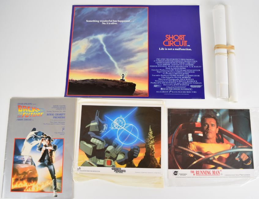 A collection of 1980s film ephemera comprising lobby cards and posters from Back to The Future, Robocop, Short Circuit, The Running Man and Transformers The Movie.