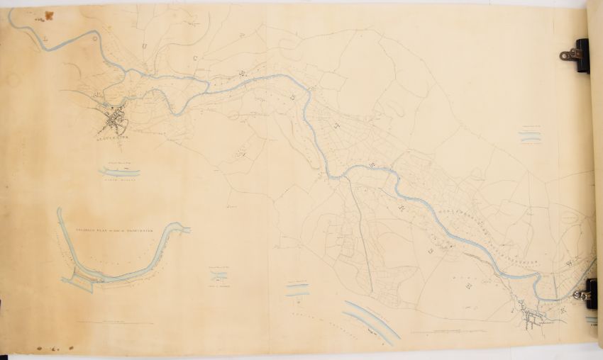 [Rhodes] Map of the River Severn Extending from Near The Lower Parting in The County of Gloucester to Gladder or Whitehouse Brook within the Parish of Areley Kings and County of Worcester showing the Proposed Cuts or Canals and the sites of the proposed Locks and Weirs for improving the Navigation of the same, through Gloucester, Tewkesbury and Worcester to Stourport, Scale 10cm to 1 mile, and includes enlarged plans, heightened in colour & engraved by J. Gardner of London [Map of a survey made under the direction of Thomas Rhodes which was originally issued in 1837 for the Severn Navigation Company], mounted on linen and extending to 360cm
