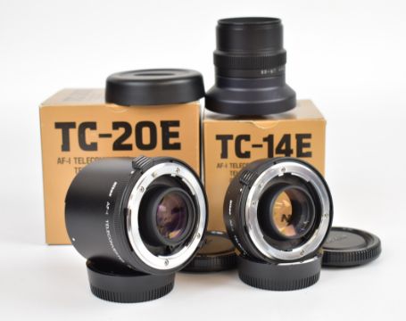 Nikon TC-20E and TC14E teleconverters, both in original boxes, and a Nikon WC-E68 wide converter lens with cover and extension tube