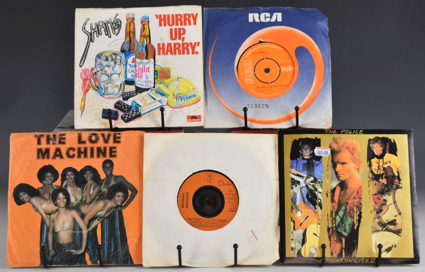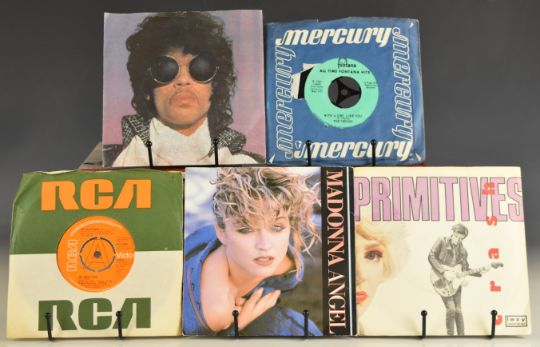 Approximately four hundred and fifty 7" singles, 1960s to 1990s Pop / Rock / Punk / Post Punk / Soul etc including Prince, Status Quo, Police, Boomtown Rats, Sham 69, The Beatles, The Rolling Stones, Isley Brothers, Madness, Peter & The Test Tube Babies, Wilson Pickett, Primatives, Madonna, Sex Pistols, Sparks, Elvis Costello, The Troggs, Tourists, Mystic Merlin, Ringo Starr, Queen, Michael Jackson, Elvis Presley, The Love Machine. Condition generally appears to be VG+, some will grade higher and some lower