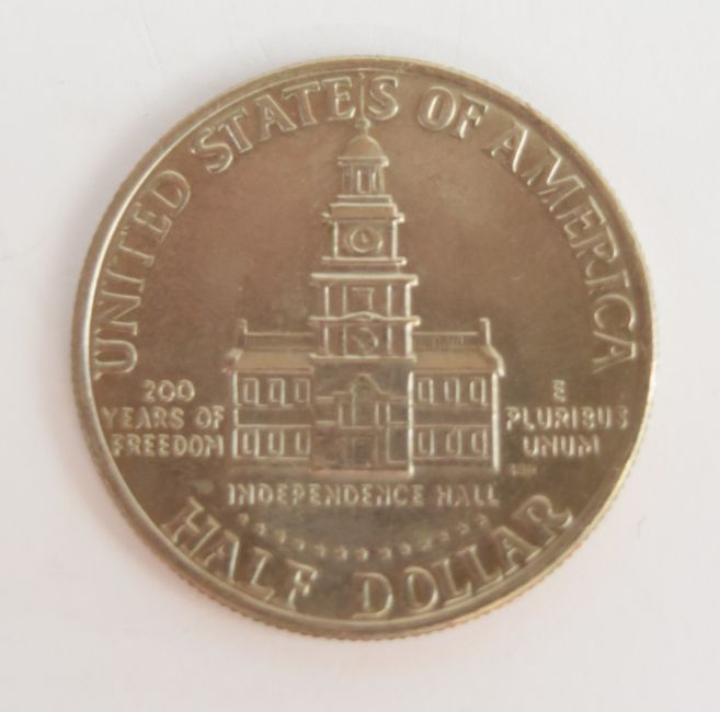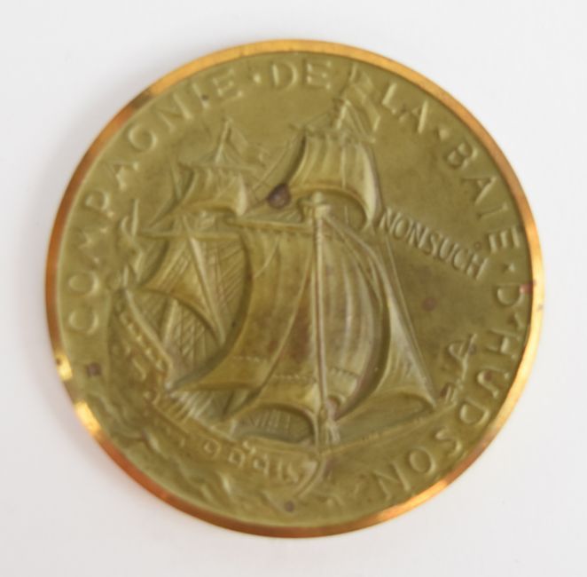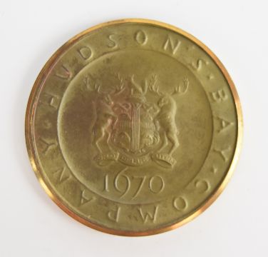 Canada 1670-1970 commemorative bronze medal for the Hudson Bay Company, obverse the Hudson Bay Company Arms, reverse the Nonsuch sailing ship starboard, bow view together with a Churchill crown, 1776-1976 Kennedy half dollar and a Hawkshead Grammar School 400m anniversary example