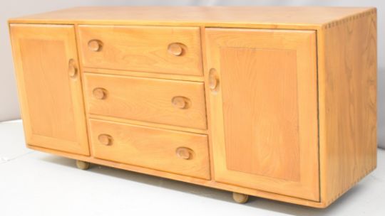 Ercol mid century modern light elm sideboard with three straight drawers flanked by two cupboards, W155 x D46 x H68cm