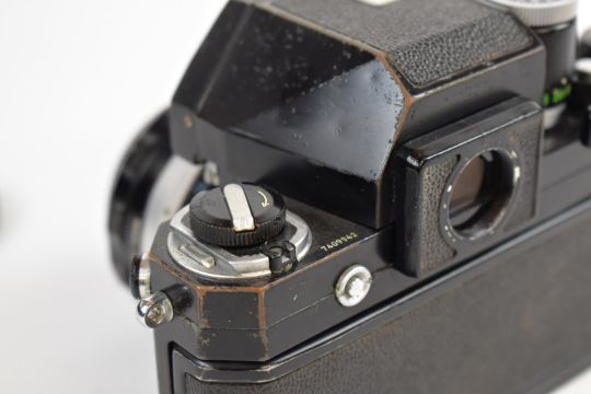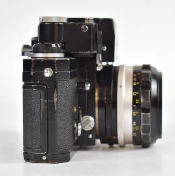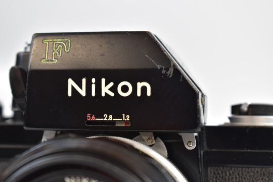 Nikon F photomic 35mm SLR camera, serial number 7409942, with Nikkor-S.C auto 1:1.4 f=50mm lens, serial number 1389839 and Nikkor lens cap