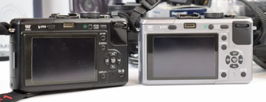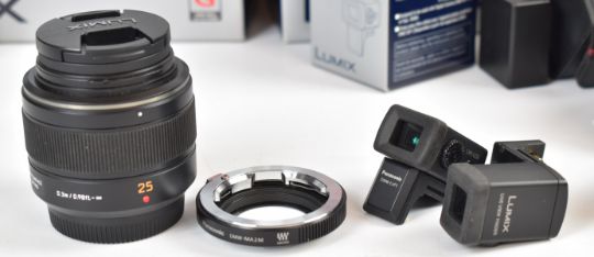 Two Panasonic GF1 micro 4/3 digital cameras, comprising one with 20mm f1.7 lens and DMW-LVF1 live viewfinder, the other with Leica 25mm f1.4 lens, together with DMW-MA2M M-mount lens adaptor, DMW-LVF1 live viewfinder, DMW-RSL1 remote, charger, batteries, instructions and boxes for bodies, lens, mount adaptor and live viewfinder