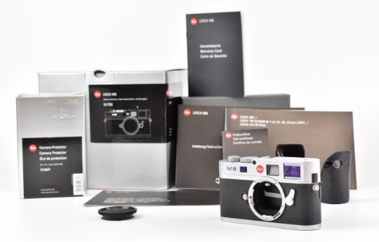 Leica M8 digital rangefinder camera chrome body, serial number 3200894, circa 2007/8, in original inner and outer boxes with charger, strap, instructions and guarantee, boxed camera body protector, the box and guarantee marked with matching serial number