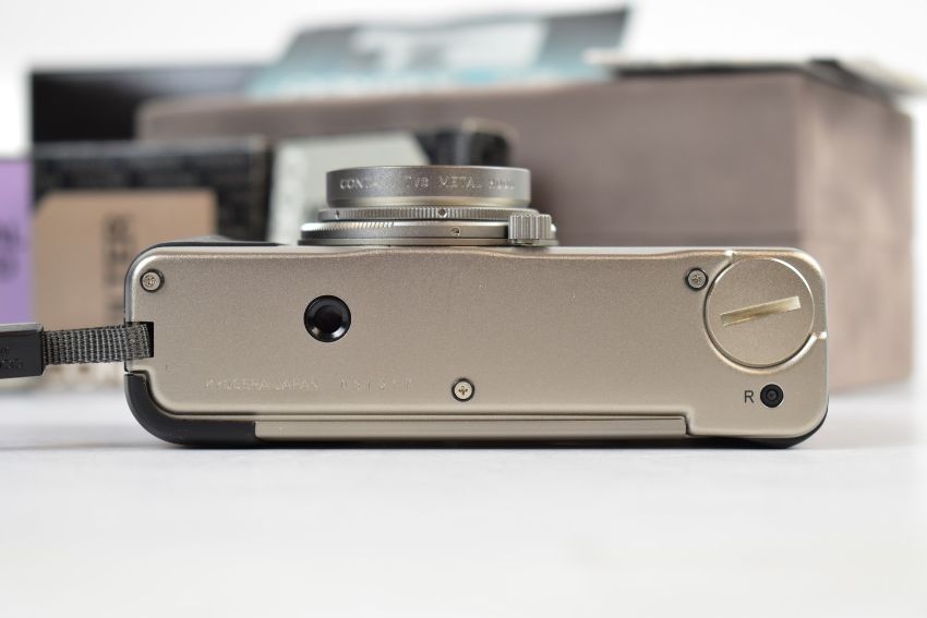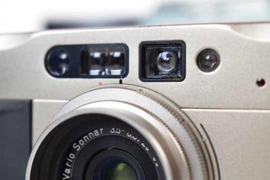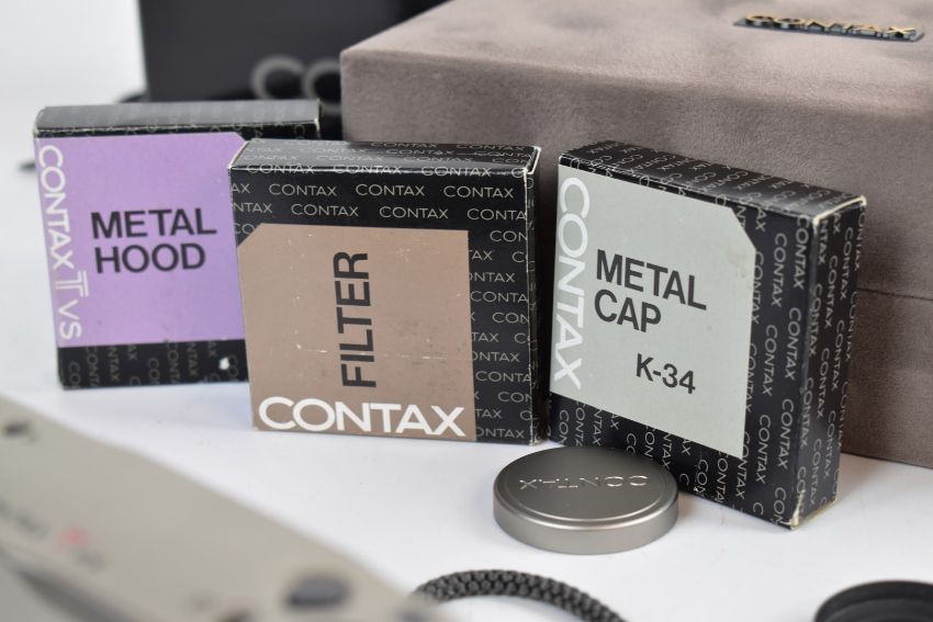 Contax TVS compact titanium 35mm rangefinder camera, serial number 031217, with Zeiss Vario Sonnar 3.5-6.5/28-56 lens, metal hood and lens cap, together with boxed 30.5mm filter, instructions for camera and boxes for metal hood and camera, the camera box with matching serial number