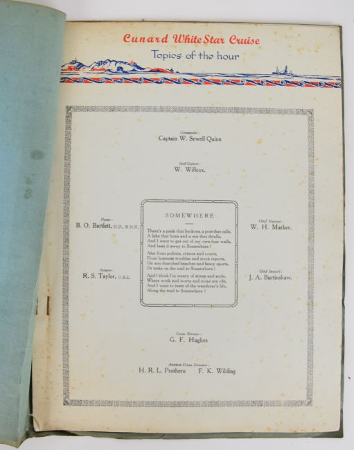 United Grand Lodge decorated certificate from his Royal Highness The Duke of Connaught and Strathearn presented to David Llewelyn Davies being initiated into Free Masonry in the Welchpool Lodge 1922. Freedom of the City of London, vellum document dated 1853 and presented to Joseph Hudson, with engraved crest and an additional handwritten presentation for 1863 on reverse, housed in original treen case with printed label. Souvenir of A Cunard White Star Line Cruise on board the S.S. Laurentic from Liverpool to Gibraltar, Barcelona, Palma & Ceruta 1934 printed brochure with itinerary and separate menu and cards. Welfare Review (Vienna) for Christmas 1946 (4)