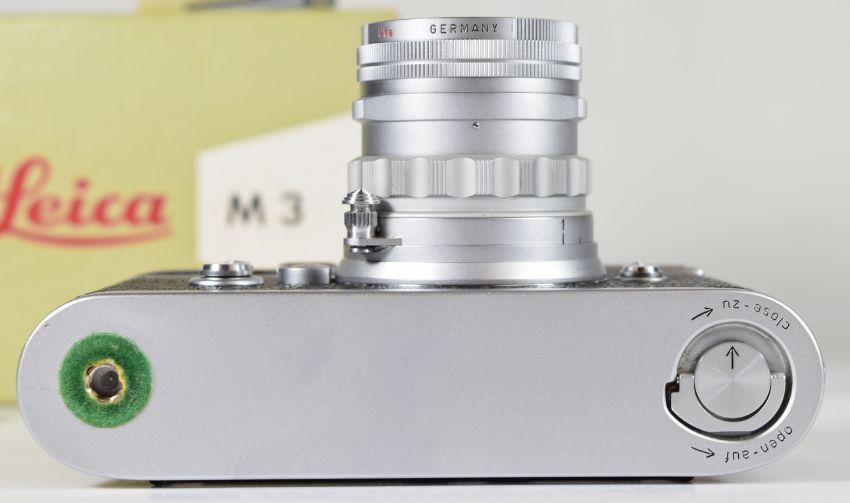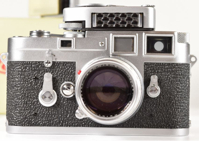 Leica M3 double stroke 35mm rangefinder camera with chrome body, serial number 895037, circa 1957, fitted with Leitz Summicron 1:2/50 lens, serial number 1706820, circa 1959, with UVa filter, Leica lens cap, MC meter and incident light attachment, in Leica M3 box