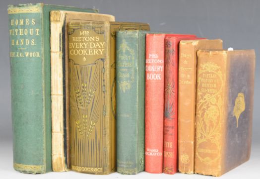 A Popular History of British Sea-Weeds by The Rev. D. Landsborough 1849 with hand-coloured plates in gilt cloth. Homes Without Hands, being a description of the habitations of animals, classed according to their principle of construction by The Rev. J.G. Wood, published 1869 with full-page plates and text illustrations in gilt cloth. Handy Book of Fruit Culture Under Glass by David Thomson 1873 with text engravings. School Botany 1847 in printed wrappers. Mrs. Beeton’s Every-Day Cookery Book 1912 with coloured and other plates in decorated gilt cloth. Cookery Book 1903. Sir Samuel Baker His Life & Adventures (c.1900). Days & Hours In A Garden by E.V.B. Elliot Stock 1884 Marianne North’s copy (English botanical artist) with her name on free endpaper, bound in gilt lettered parchment wrappers (8)