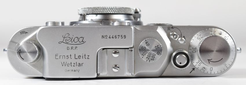 Leica IIc screw mount 35mm rangefinder camera with chrome body, serial number 446759, circa 1948-51, with Leitz Elmar f=5cm 1:3.5 lens, serial number 649691, circa 1948