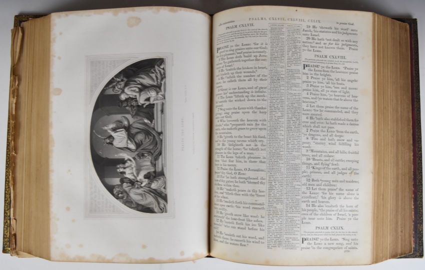 The Life of Our Lord & Saviour Jesus Christ by The Revd. John Fleetwood to which is added The Lives, Acts, Deaths and Martyrdoms of the Holy Evangelists, Apostles etc, published A.H. Payne colour illustrated title page, printed title and with full-page hand-coloured plates bound in half leather with gilt spine. The Imperial Family Bible containg Old & New Testaments illustrated by a choice series of historical designs and authentic views, published Blackie & Son 1860 with many engraved plates, thick folio bound in contemporary gilt decorated Morocco. The Christian’s Family Bible with comments and annotations by the Reverend W. Rider printed for the Author 1767 volume 2 only illustrated with engraved plates, folio bound in suede over boards, raised bands and gilt leather labels (3)