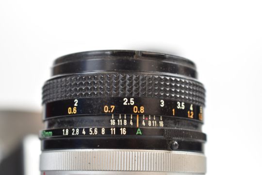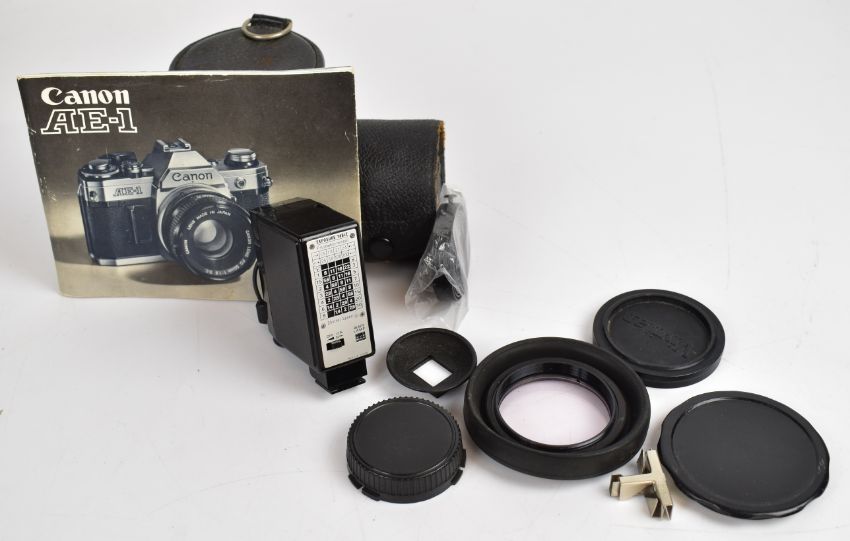 Canon AE1 35mm SLR camera outfit, serial number 2166733, with Canon FD 28mm 1:2.8 and 50mm 1:1.8 SC lenses, Vivitar 80-200mm 1:4.5 lens, Vivitar tele converter, Prinz Jupiter 275 flash and instructions