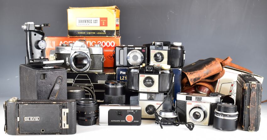 Collectable and other cameras, lenses and accessories to include plate camera with Compur shutter and Rodenstock 1:4.5 f=13.5 lens, Minolta SRT101b 35mm SLR, Vivitar 35mm 1:1.9 and Super-Paragon 1:2.8 f=28mm, Zena Bronica handle and Pro 4 filter system, Kodak Brownie 127 in original box, Agfamatic 3000 pocket, J-B Ensign, Colorsnap 35, Kodak folding camera and Lumix DMC-LZ10 digital camera