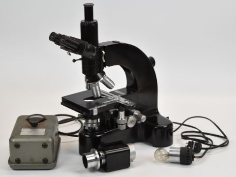 Leitz Ortholux trinocular microscope, serial number 592106, with Periplan GF 10x eyepieces and Vernier scales to stage, overall height 44cm