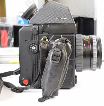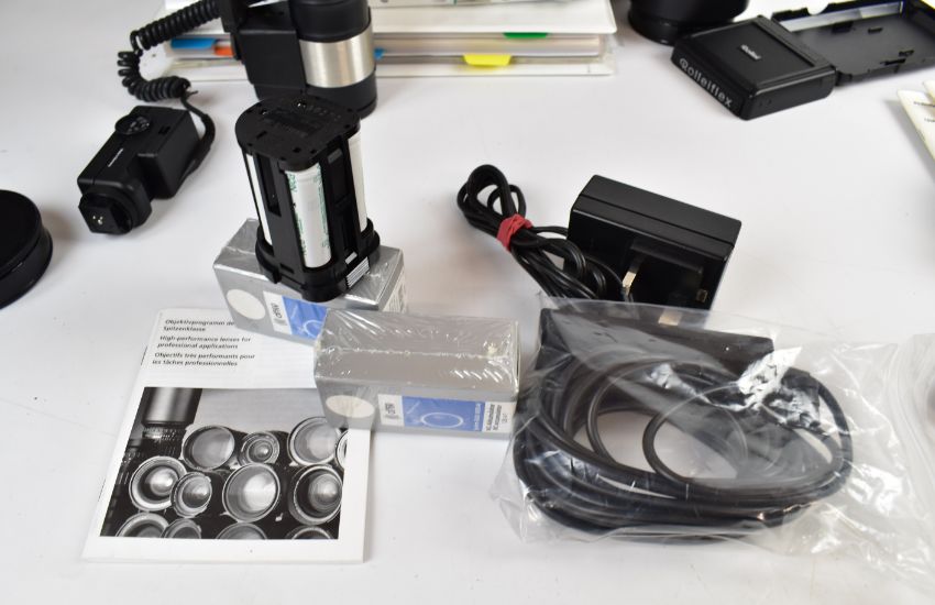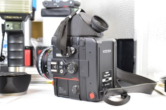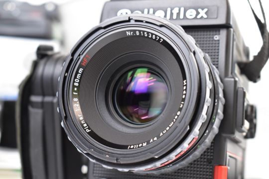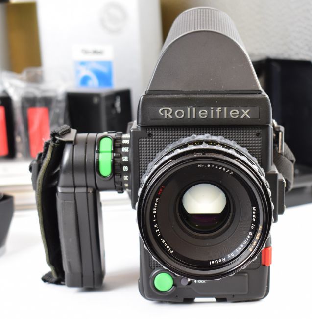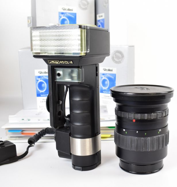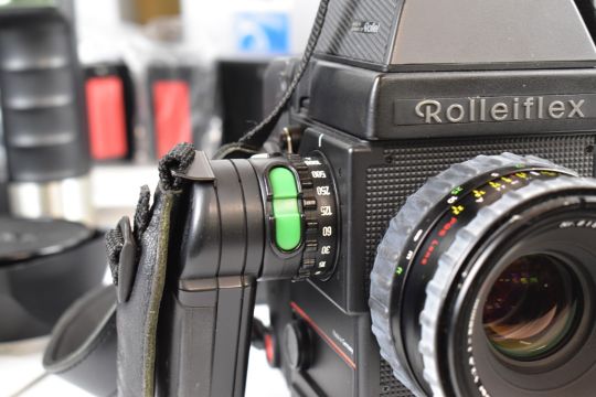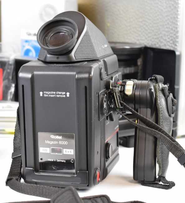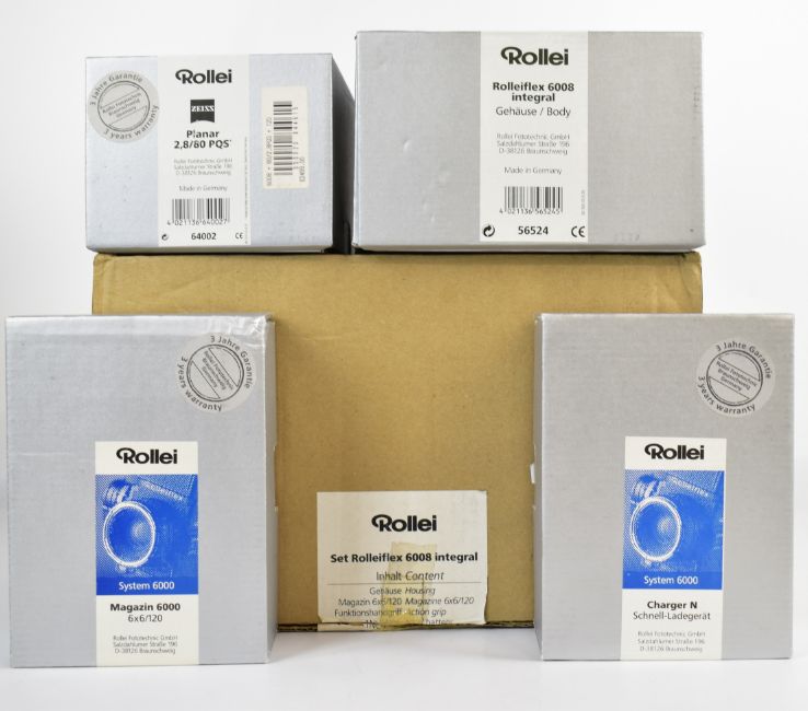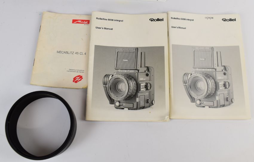 Rolleiflex 6008 integral medium format camera outfit, serial number 505550006, with Rollei Planar 1:2.8 f=80mm HFT lens, serial number 8153677, Rollei lens hood and cap, Schneider-Kreuznach Tele-Xenar 1:2.8 f=180mm HFT lens, serial number 14456042, with hood and front and rear covers, helioplan and B+W 95mm filters, waist level and prism finders, 6x6 120 6000 magazine, two further film inserts, Metx 45CL-4 flash gun, Rollei RC120 remote, original boxes for camera, lens, magazine and batteries and an aluminuim flight case