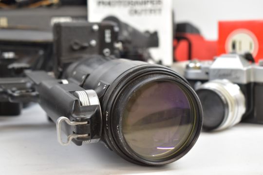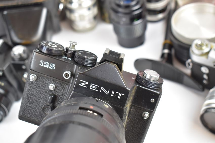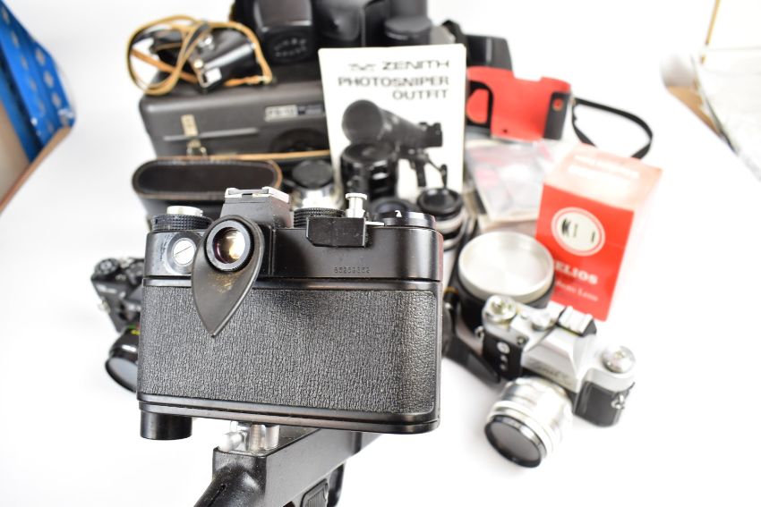 Zenit and similar 35mm SLR cameras, lenses and accessories to include Zenit 3M with 2/58 lens, Zenith 12XP with Helios 2/58 lens, Zenit 12S with 4.5/300 lens and photosniper grip, screw mount Russian 4/135 lens, D&N Japanese 1:3.5 f=35mm lens and Helios f=135mm 1:2.8 lens