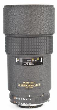 Nikon ED AF Nikkor 180mm 1:2.8 D SLR camera lens, serial number 401287, with front and rear covers