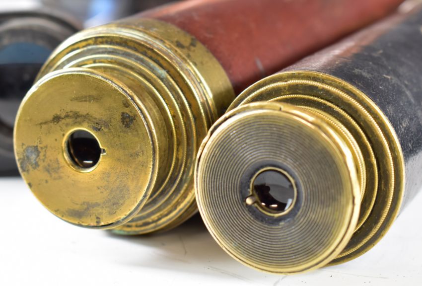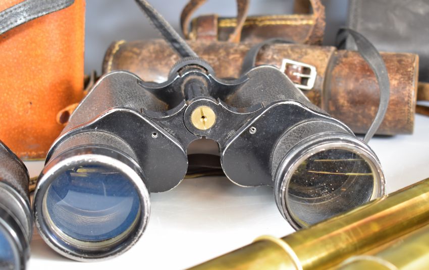 Two 19th century telescopes, one Ross three draw the other Watkins four draw, and five pairs of binoculars comprising Anchor 7x50, Olympus 8x25, Bushnell Expo, Omega 7x50 and Frank-Nipole 10x50