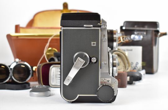 Mamiya C3 Professional TLR medium format camera outfit, serial number 252205, with Mamiya-Sekor 1:2.8 f=80mm and 1:4.5 f=18cm lenses, serial numbers 1088618 and 1141555 respectively, lens caps for both, lens hood, UV and one other filters, waist level and CdS magnifying hood finders, the latter in original box, Weston light meter, handle and Omnica case