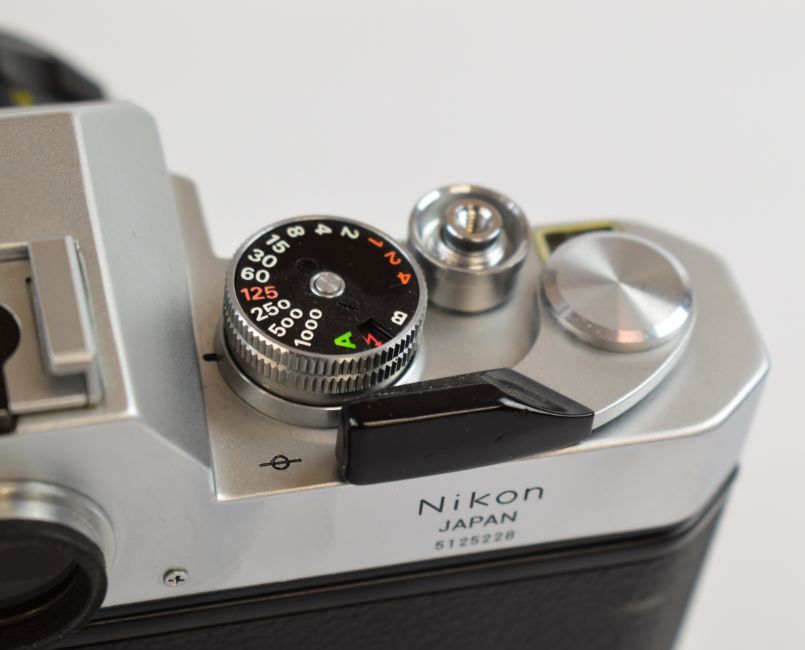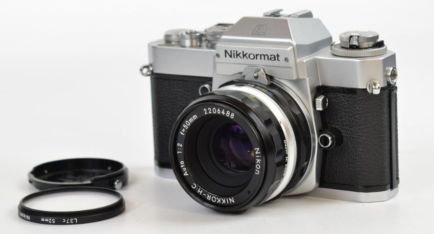 Nikon Nikkormat EL 35mm SLR camera, serial number 5125228, with Nikkor-H.C auto 1:2 f=50mm lens, serial number 2206488, with L37c filter and Nikkor cap
