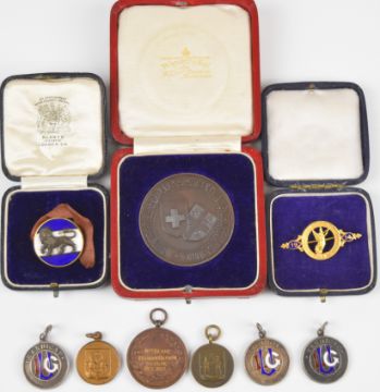 9ct gold '1914' ladies pictorial Golf Competition brooch, three Ladies Golf Union enamel and silver 'Handicap' fobs, cased bronze medallion 'The Red Cross Day at The Ranelagh 1915' given in appreciation by the War Committee and a Wembley Exhibition cased lapel badge
