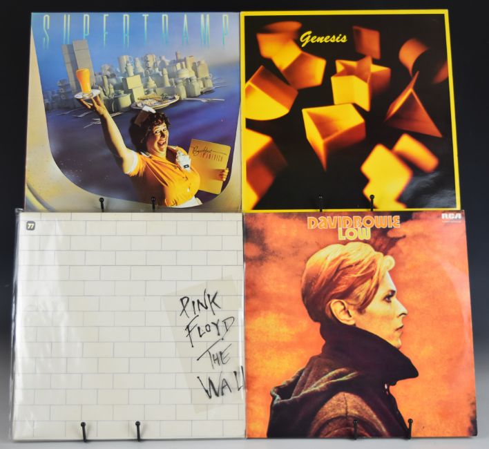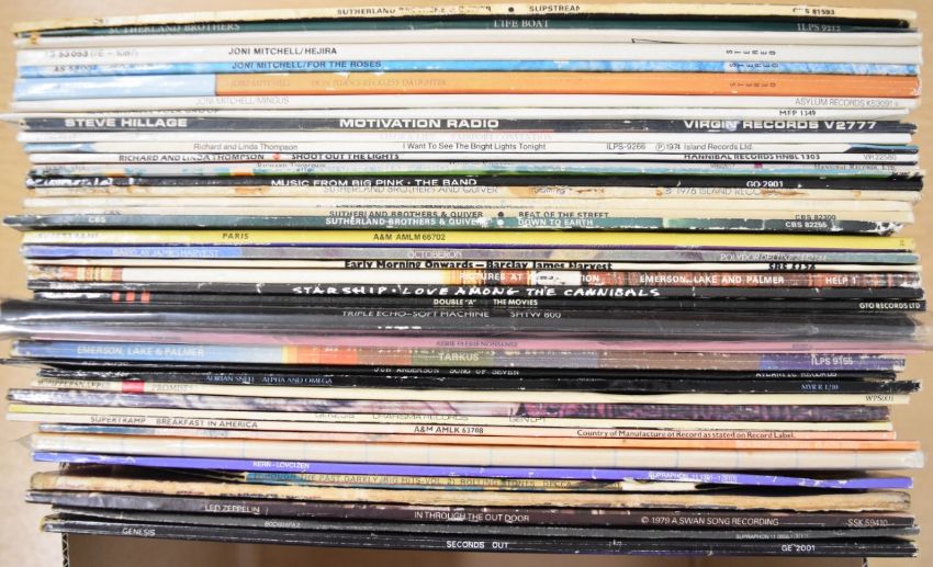 Approximately forty two Prog Rock / Heavy Rock / Folk Rock  LPs including King Crimson In the Court Of The Crimson King, The Rolling Stones, Kern, Led Zeppelin, David Bowie, Pink Floyd, Genesis, Supertramp, Roy Harper, Jon Anderson, Rockmapa 2, Barclay James Harvest, ELP, Starship, Soft Machine, Tarkus, Joni Mitchell etc. Most appear VG to Ex+, some may grade lower