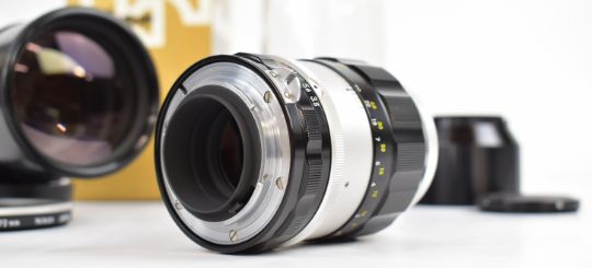 Two Nikon SLR camera lenses comprising Nikkor-Q auto 1:3.5 f=135mm, serial number 951695, with HS-8 hood and Nikon lens cap, in Nikon bubble and original box with matching serial number, and Nikkor-P auto 1:2.8 f=180mm, serial number 313015 with L1Bc filter and Nikon front and rear covers