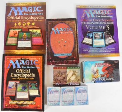 A collection of Magic the Gathering playing card decks and rulebooks to include the Anthologies boxed set, Wizards of the Coast.