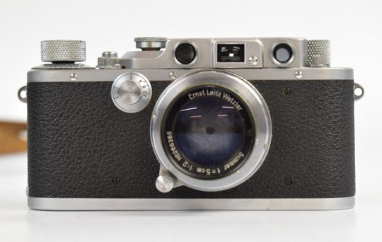 Leica IIIb 35mm rangefinder camera, serial number 328205, circa 1939, with Ernst Leitz Summar f=5cm 1:2 lens, serial number 266365, circa 1935, with lens cap and leather case