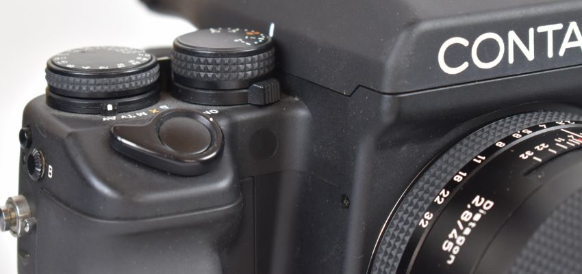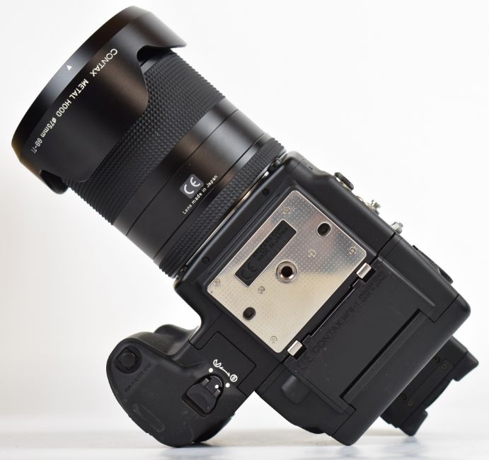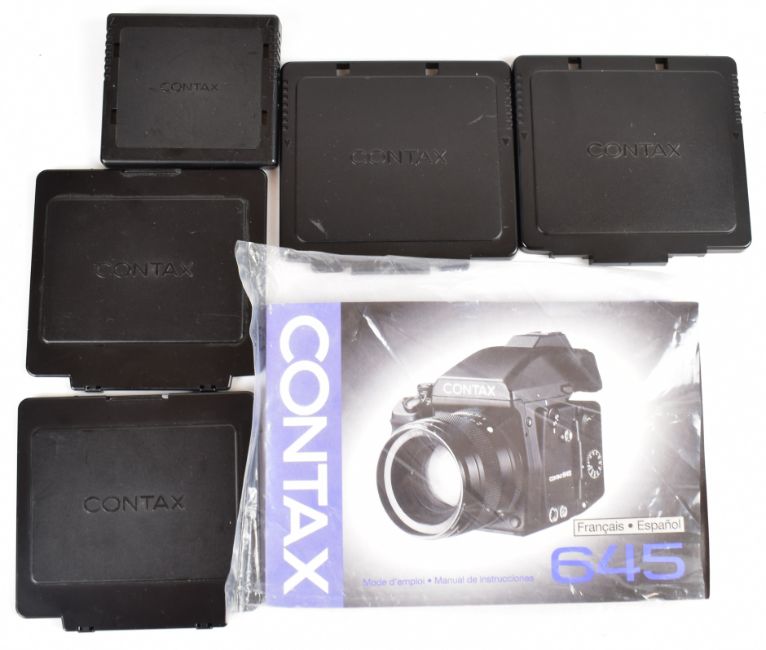 Contax 645 medium format camera outfit, serial number 013909, with Zeiss Distagon 2.8/45 T* lens, with Hoya filter, GB-71 hood, Contax lens cap, MFB-1 film back and two extra MFB-1A film inserts, MF-1 prism finder, MFS-2 and MFS-3 focusing screens, 52mm extension tube, instructions and boxes for camera body, extension tube, film insert, prism finder and focusing screen