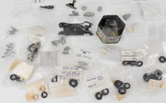 A small collection of Dinky Toys diecast model traffic signs, petrol pumps and similar, together with a group of spare castings.