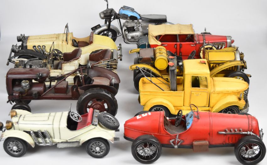 Nine vintage look pressed steel veteran cars and similar, largest 34cm long.