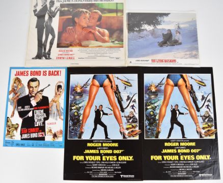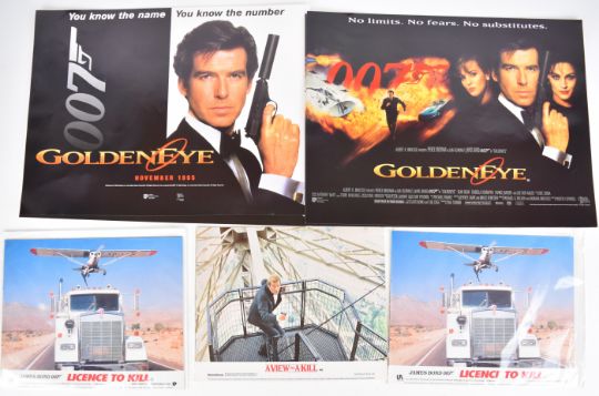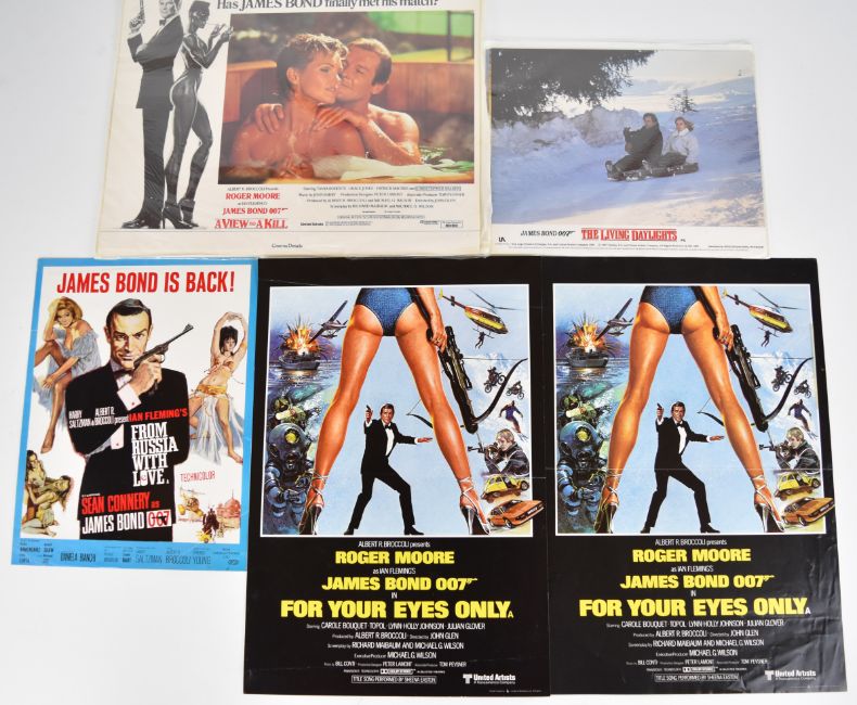 A collection of James Bond 007 film lobby card sets and promotional posters comprising titles Licence to Kill, The Living Daylights, Goldeneye, From Russia with Love, For Your Eyes Only and A View to a Kill, largest 38 x 28cm.