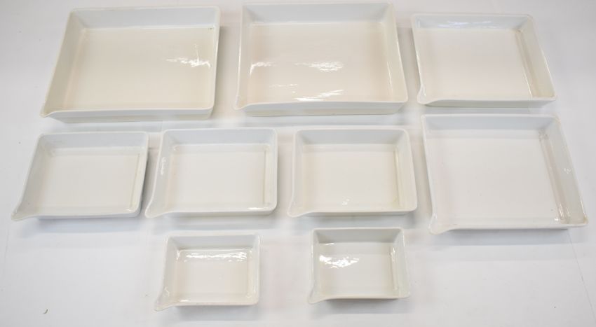 Nine vintage ceramic photography darkroom processing trays, some marked Ensign, largest 44 x 36cm