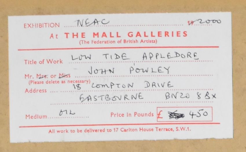 John Powley (b1929) WGA Wapping Group 'Low Tide Appledore' with exhibition label verso, 30 x 23cm