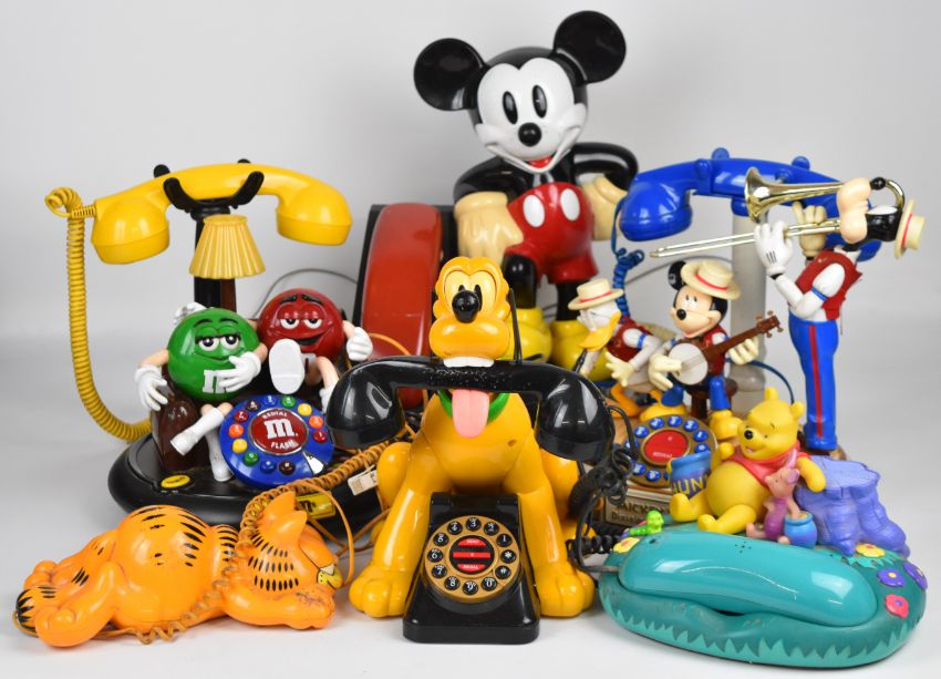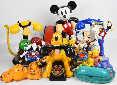 Six novelty character telephones comprising Mickey Mouse, Pluto, Disney Dixieland Band, M&Ms, Garfield and Winnie the Pooh.