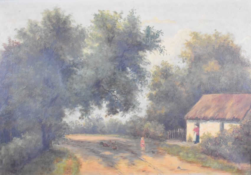 19th / 20thC oil on canvas of a woman beside a cottage and girl with toy and fowl in a sunny lane, in ornate gilt frame, 34 x 50, the frame 54 x 69cm