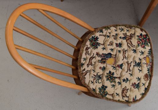 Ercol mid century modern light elm drop leaf table and four hoop backed chairs, W126 extended x D110 x H73cm