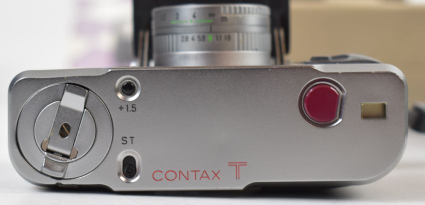 Contax T compact titanium 35mm rangefinder camera, serial number 028044, with Zeiss Sonnar 2.8/38/T* lens and T14 flash unit, instruction manual and original boxes with matching serial number