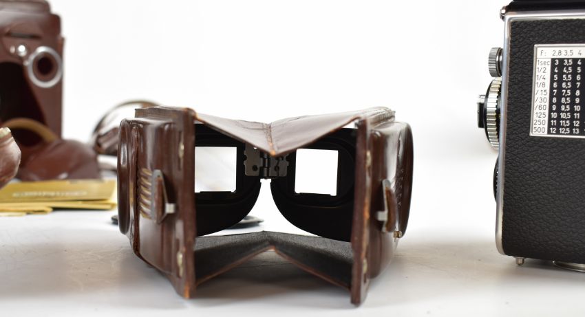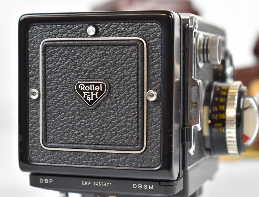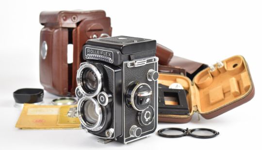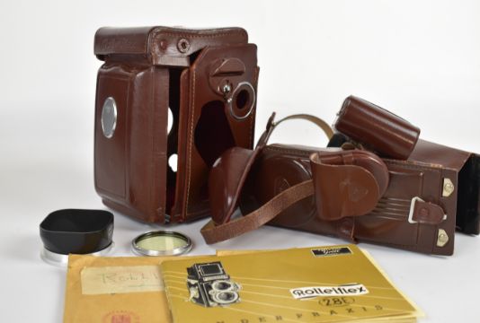 Rolleiflex 2.8F K7F2 TLR camera, serial number 2.8F 2455471, with Zeiss Planar 1:2.8 f=80m lens, with lens hood, cover and filter, in original leather case with 2.8E instructions and accessory booklet, a magnifying hood and Rolleikin 35mm kit