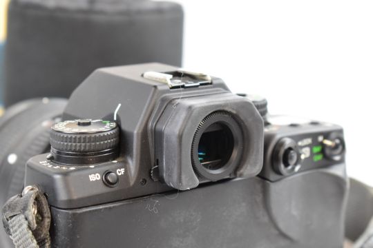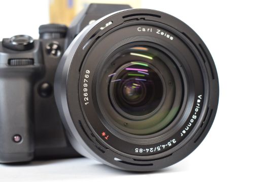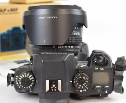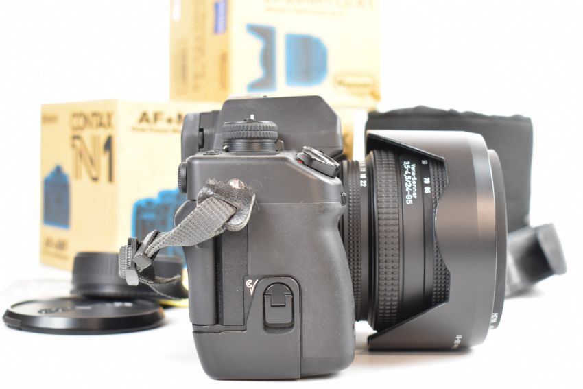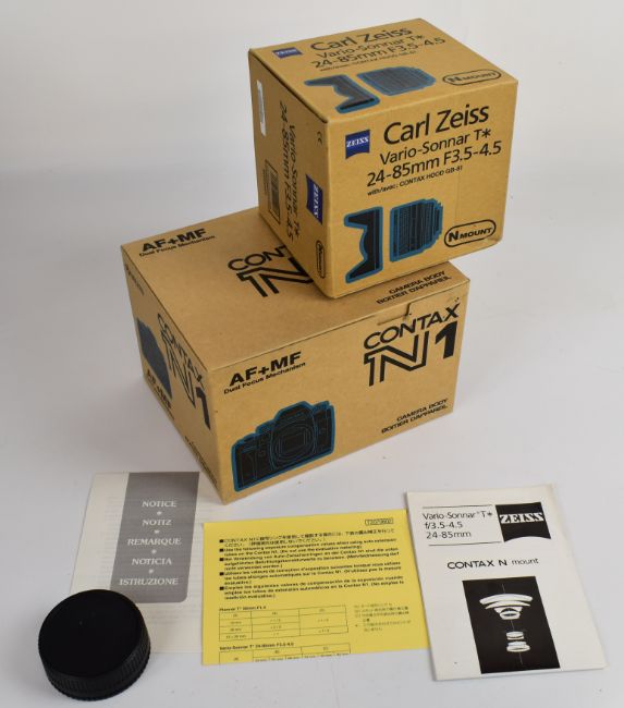 Contax N1 35mm SLR camera, serial number 007954, with Zeiss Vario-Sonnar 3.4-4.5/24-85 T* lens, serial number 12699769, Hoya filter, Contax GB-81 hood and lens cap, with lens instructions, soft case, lens  and body caps and original boxes for camera and lens, both with matching serial numbers