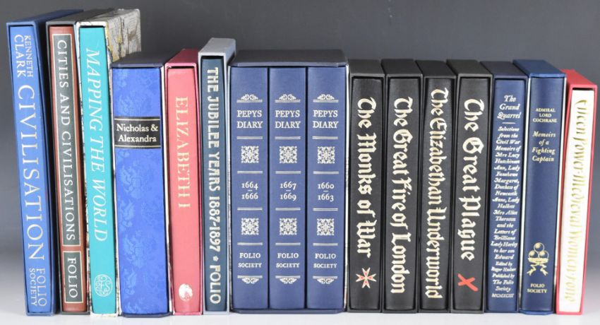 [Folio Society] Pepys’ Diary 1660-1669 in 3 volumes. Great Fire of London in 1666, The Great Plague, The Monks of War and The Elizabethan Underworld all in red and silver pictorial bindings. Nicholas & Alexandra by Massie 2002. Elizabeth II. Mapping The World, A History of Exploration 2000. The Jubilee Years 1887-1897. Civilisation by Kenneth Clark together with four others, all in slipcases (16)