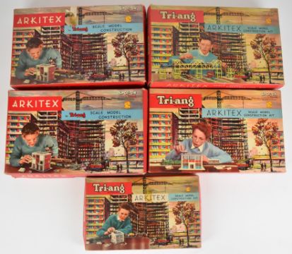 Five Tri-ang Arkitex 00 scale model construction sets comprising kits A, B, D and E x2, all in original boxes.