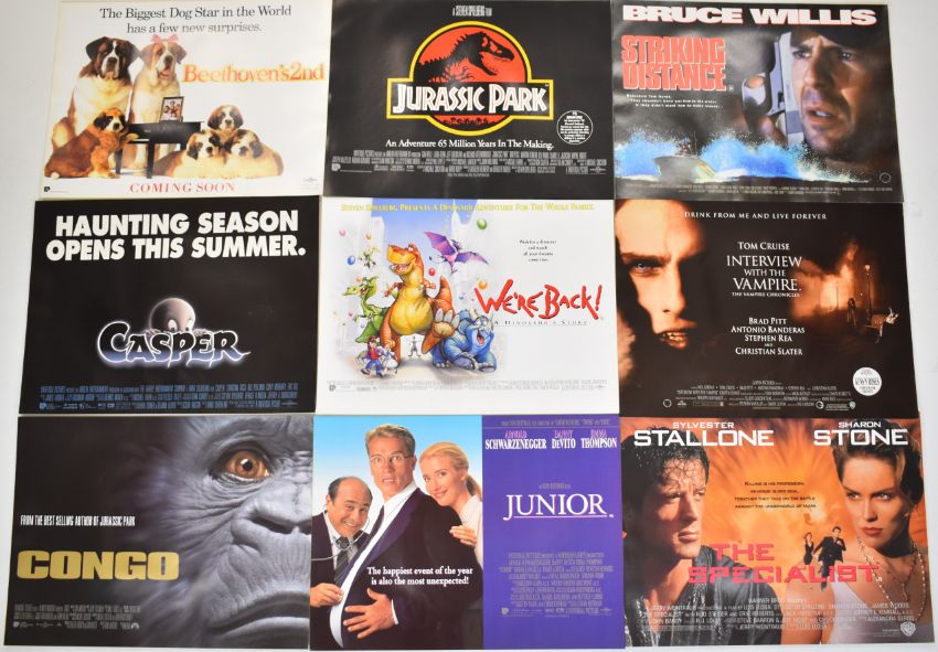 Approximately two-hundred and fifty 1990s front of house cinema / film posters to include Jurassic Park, Congo, Interview With A Vampire, The Net, Goldeneye, Mars Attacks, Edward Scissorhands, Men in Black, Alien Resurrection, Braveheart, The Saint, The Firm, Jerry Maguire, Batman Forever, Schindler's List and Mary Shelley's Frankenstein. Each poster measures 40 x 30cm.