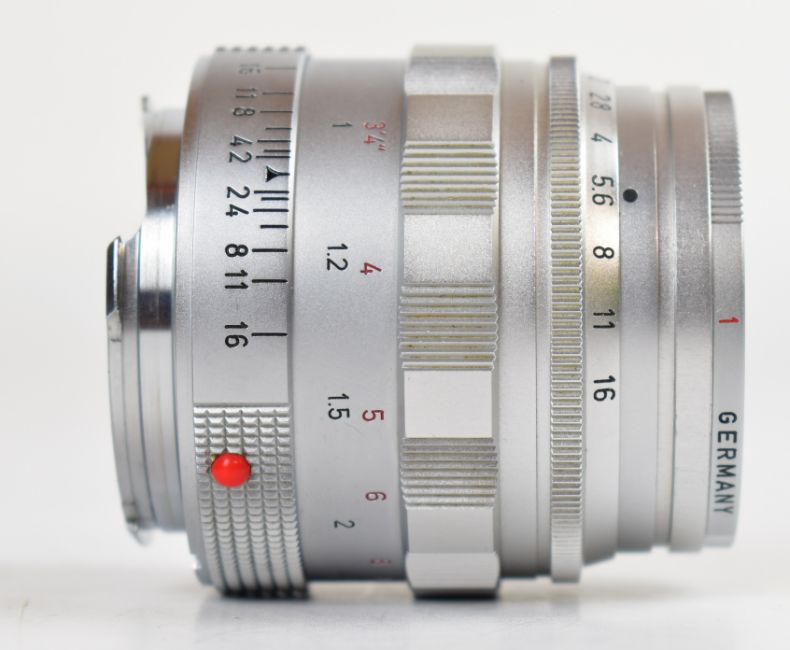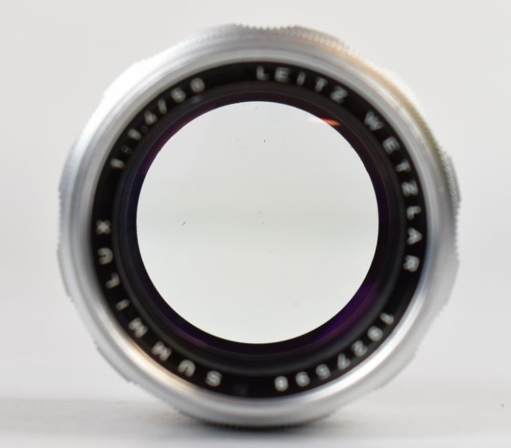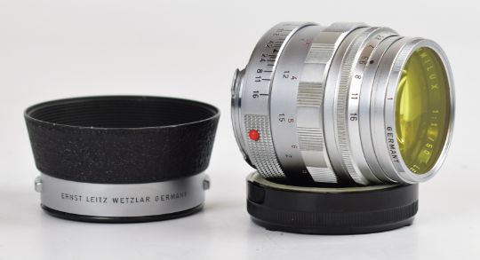 Leitz Summilux M mount 1:1.4/50 camera lens, serial number 1927598, circa 1962, with filter, 12521G hood, Leica lens cap and Leitz rear cover