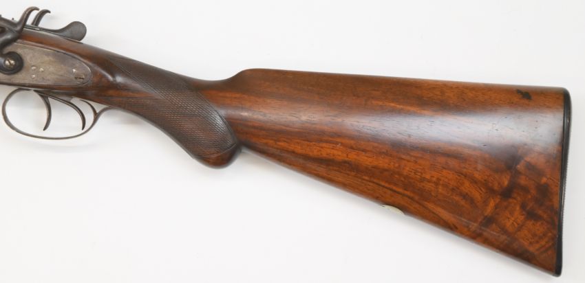 Midland Gun Company 12 bore side by side hammer action shotgun with engraved locks featuring dogs and birds, hammers, trigger guard, underside, thumb lever, fences and top plate, chequered semi-pistol grip and forend, vacant cartouche to the underside of the stock, double trigger and named 30 inch Damascus barrels choked ¾, overall length 118cm, length of pull 36cm, serial number 55026. PLEASE NOTE THAT A VALID RELEVANT FIREARMS/SHOTGUN CERTIFICATE IS REQUIRED TO HANDLE/PURCHASE THIS ITEM.