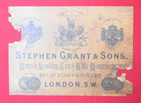 Stephen Grant & Sons brass and leather bound oak double shotgun carry case with fitted interior, 'By Special Appointment To The King Stephen Grant & Sons Breech Loading Gun & Rifle Manufacturers 67A St James's Street London SW' label and 'Charges For Breech Loading Guns' label, 85x30x9cm.